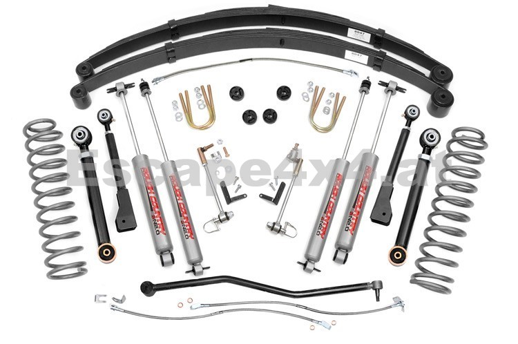 Fahrwerk Rough Country Lift Kit Jeep Cherokee XJ 4,5" beinhaltet alles für Höherlegung des Fahrwerks um +11,5 cm. Die Stoßdämpfer gefüllt mit Stickstoff, die vorderen Schraubenfeder und hinteren Blätter statt der originalen Blattfedern. Inkl. des Montagematerials und der vorderen verstärkten Lenker.