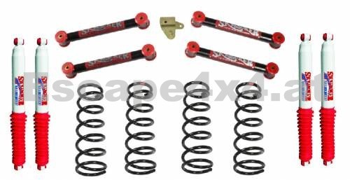 Fahrwerk Skyjacker Lift Kit Jeep Grand Cherokee ZJ 3" + Lenker, beinhaltet alles für Höherlegung des Fahrwerks um +7,5 cm. Die Gas-Flüssigkeitsstoßdämpfer, die vorderen und hinteren Schraubenfedern. Inkl. des Montagematerial und der verstärkten Lenker.
