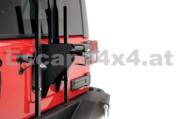 Heavy Duty Reserveradhalter von Smittybilt, für Jeep Wrangler JK 2007-. Kompatibel mit 3 und 5 Türer. Montage an den Original Befestigungspunkten, Reifengrösse bis 37" möglich, verstellbar.