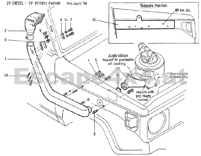 Der Schnorchel ist für die Gesellschaft ESCAPE aus Kunststoff LLDPE hergestellt, der hoch kratz- und stoßfest ist. Er beinhaltet alle nötigen Komponenten und Schablonen.